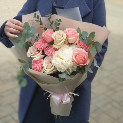 Бархатный цилиндр из голубых диантусов, розовых пионов и ароматной маттиолы