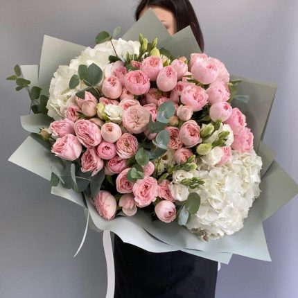 Садовая композиция с гортензиями, пионами, пионвоидными розами и колокольчиками