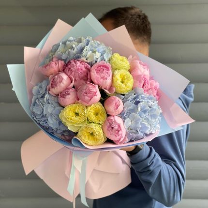 Жемчуга – Шляпная коробка с пионами, гортензиями и пионовидными розами