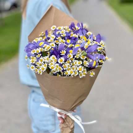 Цветы в коробке с ирисами,тюльпанами, розами,эустомой,хлопком и ягодами вибурнума