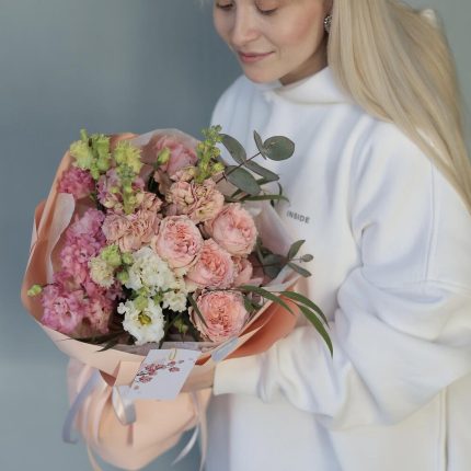 ЧЕРНИЧНЫЙ ЙОГУРТ 9 премиальных пионовидных роз с белым лимониумом в крафт бумаге