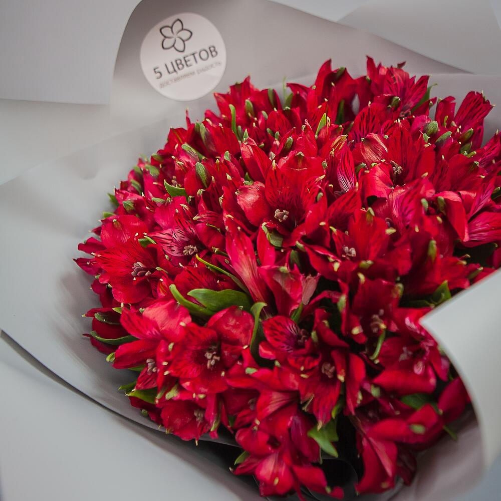 Альстромерия красная – 19 шт.Упаковка матовая пленка – 1 шт.Лента атласная – 1 шт.