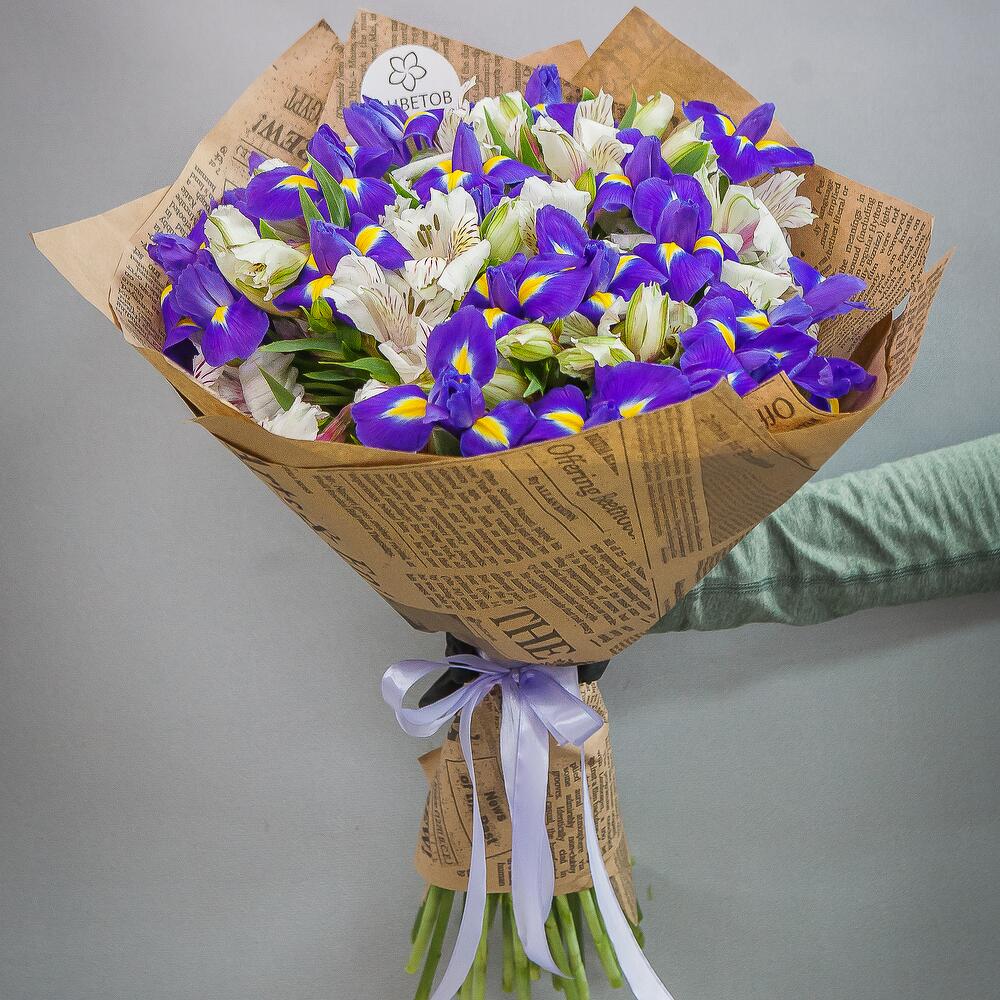 Альстромерия белая – 15 шт.ирисы – 20 шт.Упаковка крафт – 1 шт.Лента атласная – 1 шт.