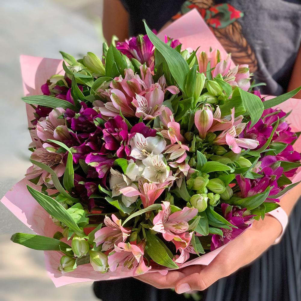 Классический букет из разноцветных альстромерий в стильном оформлении.