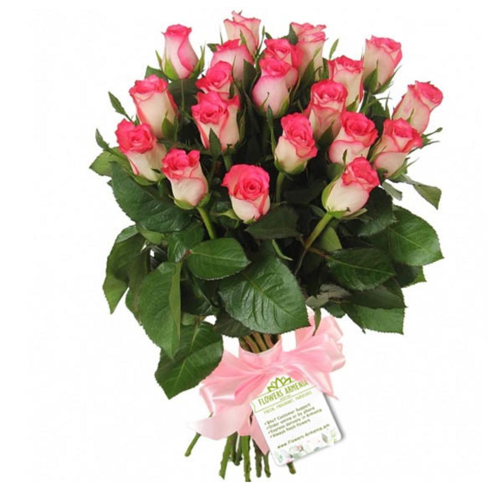 A bouquet of 21 white and pink Dutch roses "Jumilia" with a pink ribbon. The height of the stem is 55-66 cm.