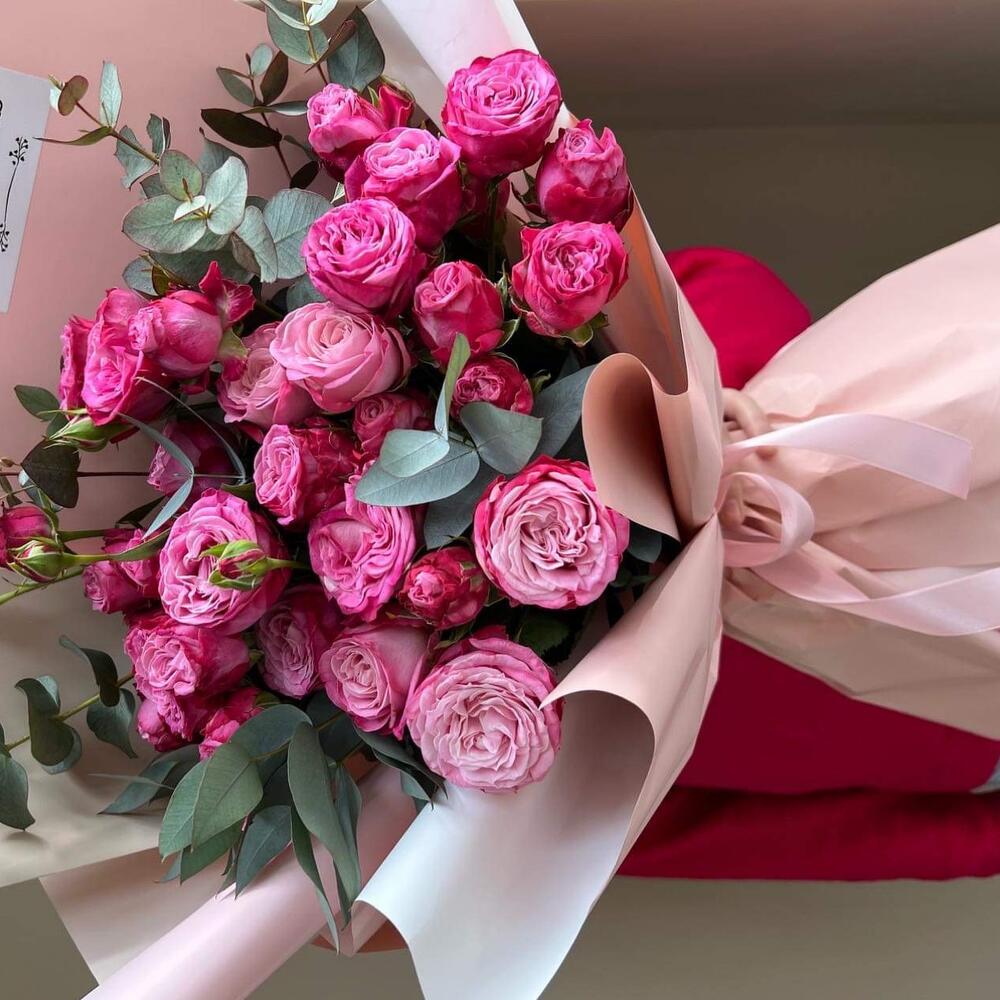 Букет из 7 веток кустовых роз и 2 ветки евкалипта