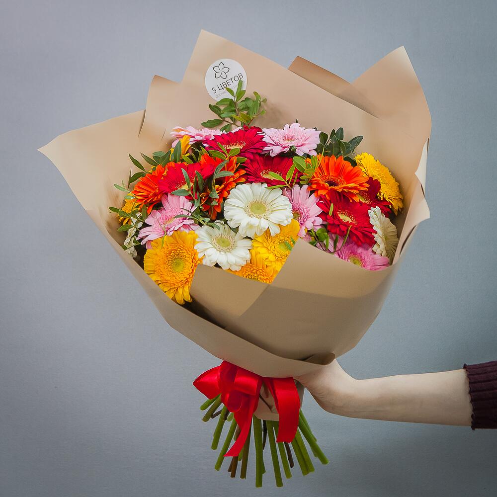 Гербера желтая – 5 шт.Гербера красная – 5 шт.Гербера розовая – 5 шт.Гербера белая – 5 шт.Гербера кремовая – 3 шт.фиолетовая – 2 шт.