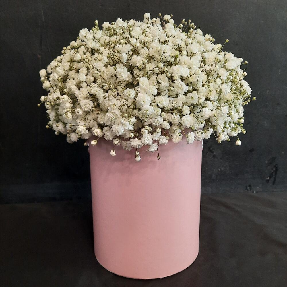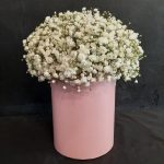 “Сиреневый туман” – композиция из гипсофилы в шляпной коробке