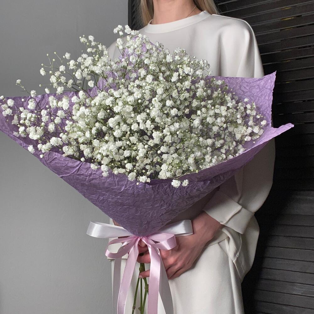 гипсофила белая – 5 шт.Корейская пленка – 1 шт.Атласная лента – 2 шт.