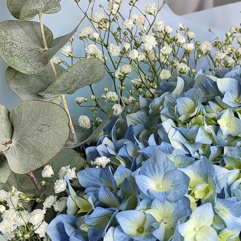 Гипсофила – 1 шт.Гортензия – 1 шт.Эвкалипт – 2 шт.Лента атласная – 1 шт.Тишью – 2 шт.Упаковка дизайнерская – 2 шт.