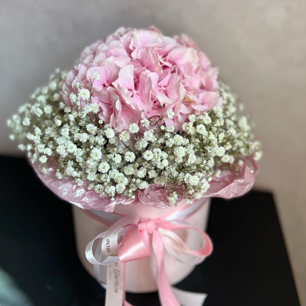 шляпная коробочка m – 1 шт.Флористическая губка (оазис) – 1 шт.Гортензия – 1 шт.Гипсофила – 4 шт.Атласная лента – 1 шт.