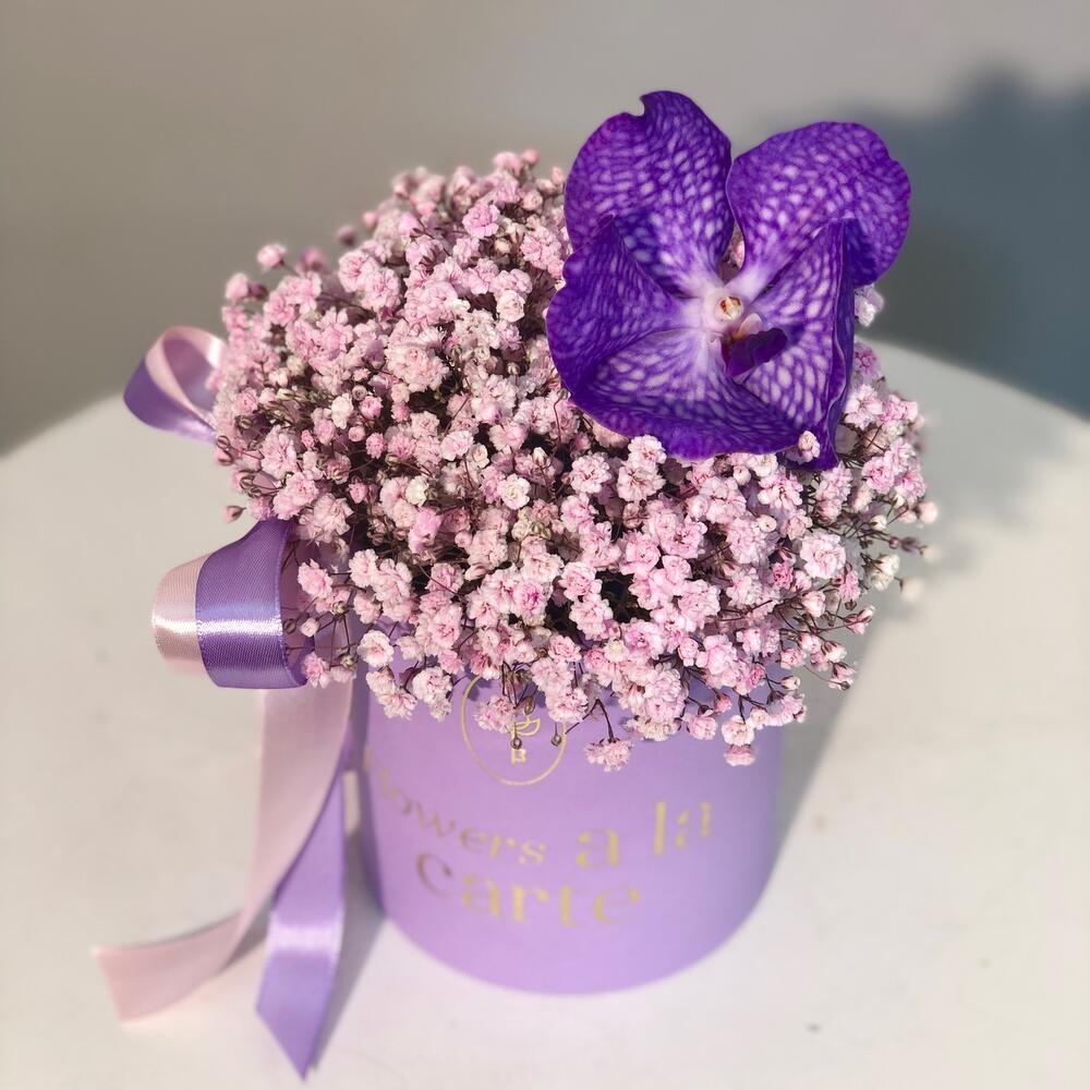 Гипсофила – 4 шт.Орхидея Ванда – 1 шт.Лента атласная – 2 шт.Оазис флористический – 1 шт.коробка шляпная маленькая – 1 шт.