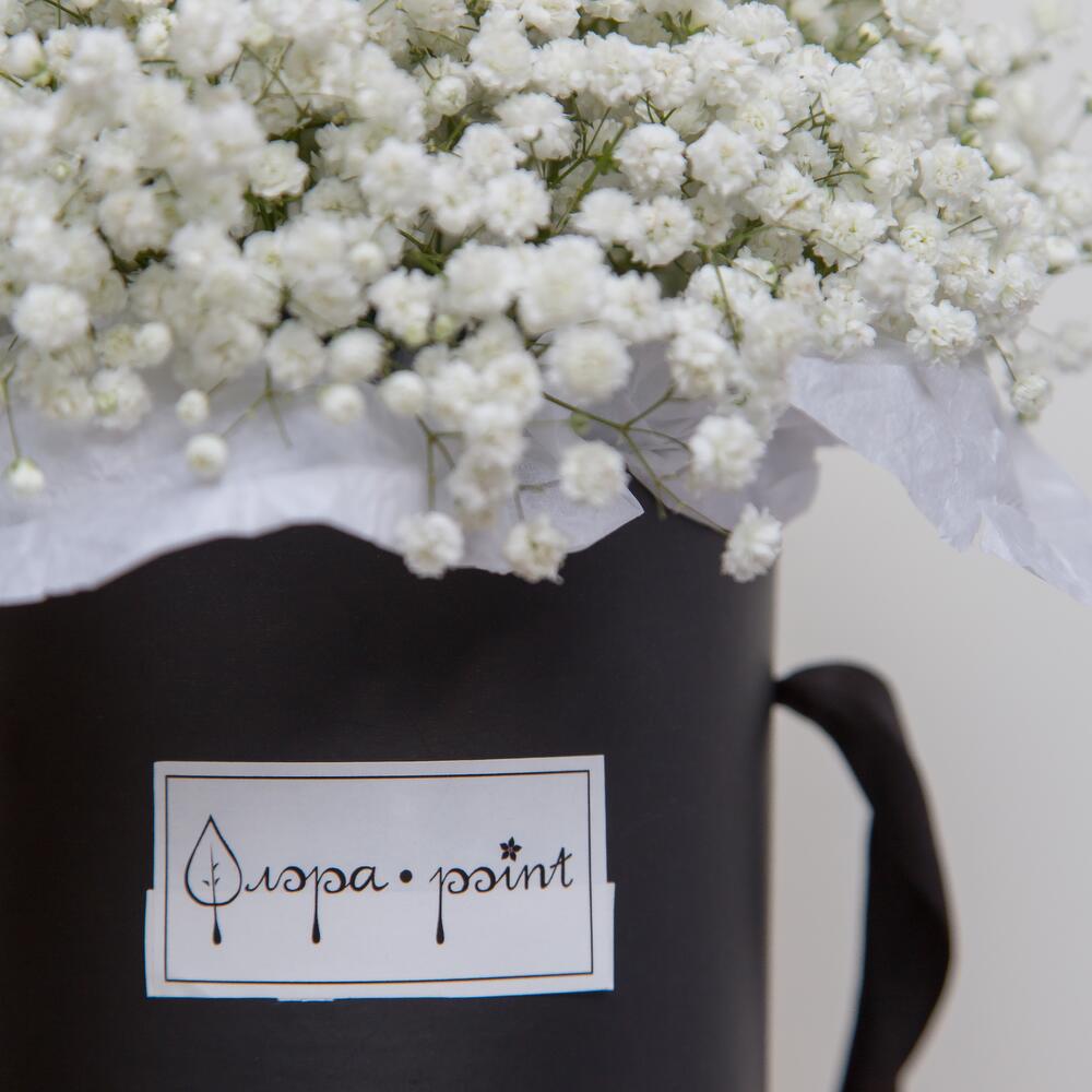 Гипсофила – 8 шт.Коробка шляпная – 1 шт.Оазис – 1 шт.