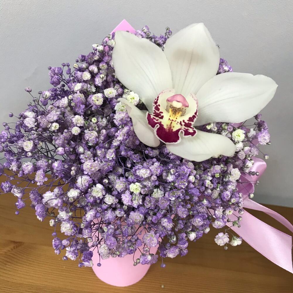 “Сиреневый туман” – композиция из гипсофилы в шляпной коробке