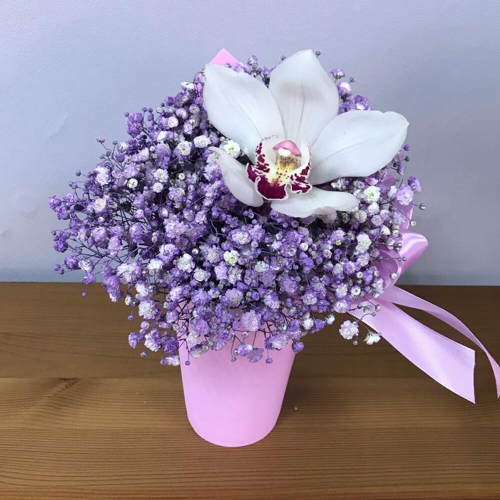 Гипсофила – 4 шт.Орхидея Цимбидиум – 1 шт.Оазис флористический – 1 шт.Стакан – 1 шт.оформление флоамиран – 1 шт.