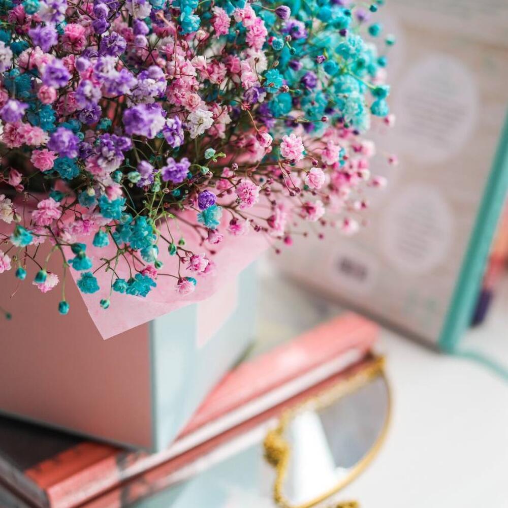 “Сиреневый туман” – композиция из гипсофилы в шляпной коробке
