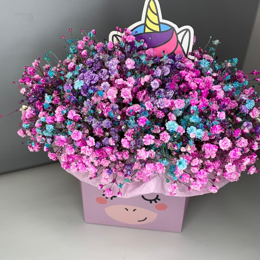 гипсофила радужная – 5 шт.Коробка – 1 шт.Тишью – 2 шт.Топпер – 1 шт.Пленка прозрачная – 1 шт.Лента атласная – 2 шт.