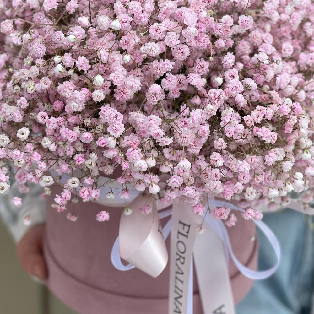 Гипсофила – 21 шт.Коробка бархатная – 1 шт.Оазис флористический – 1 шт.лента фирменная – 2 шт.