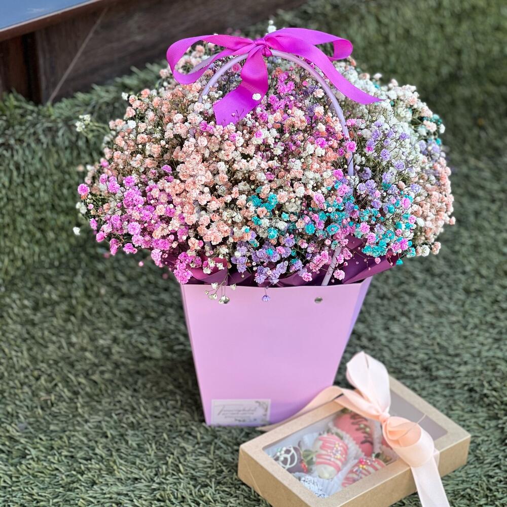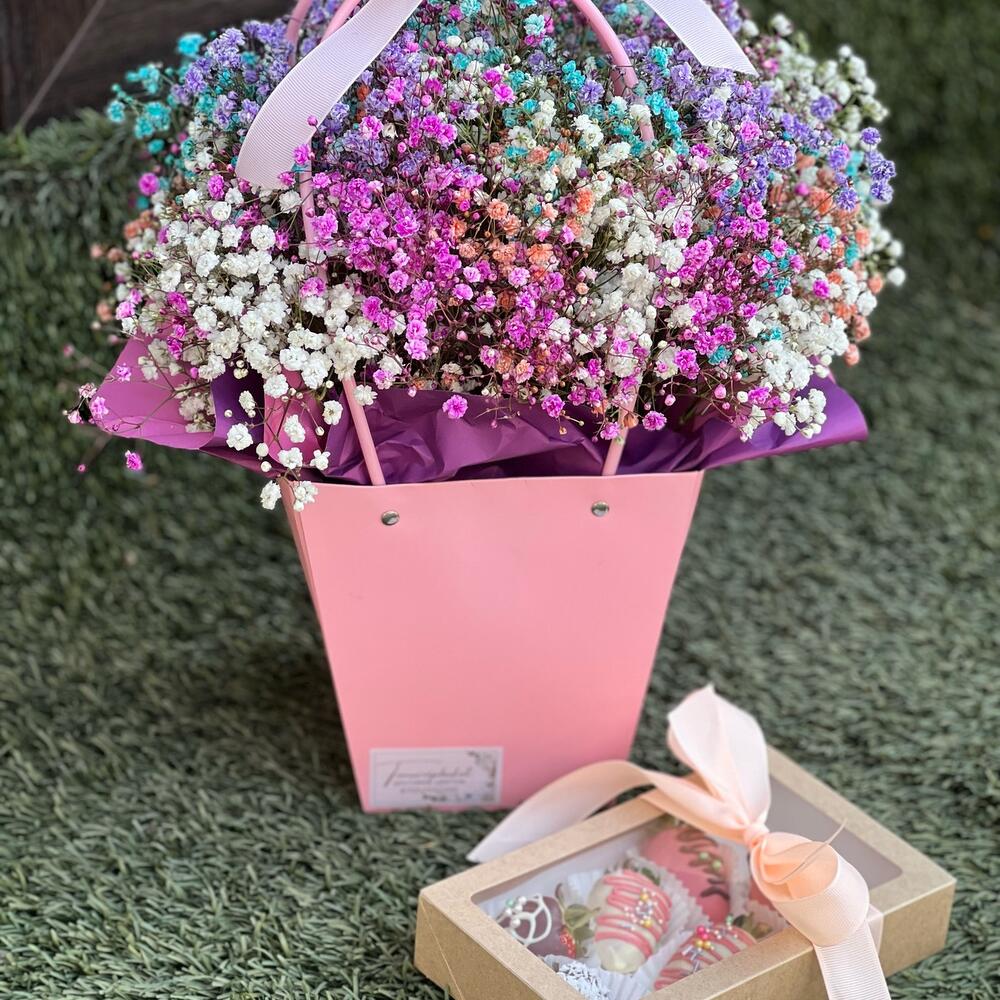 Яркая радужная композиция с гипсофилой совместно с вкуснейшей клубникой в бельгийском шоколаде станут отличным дуэтом в качестве подарка для ваших близких