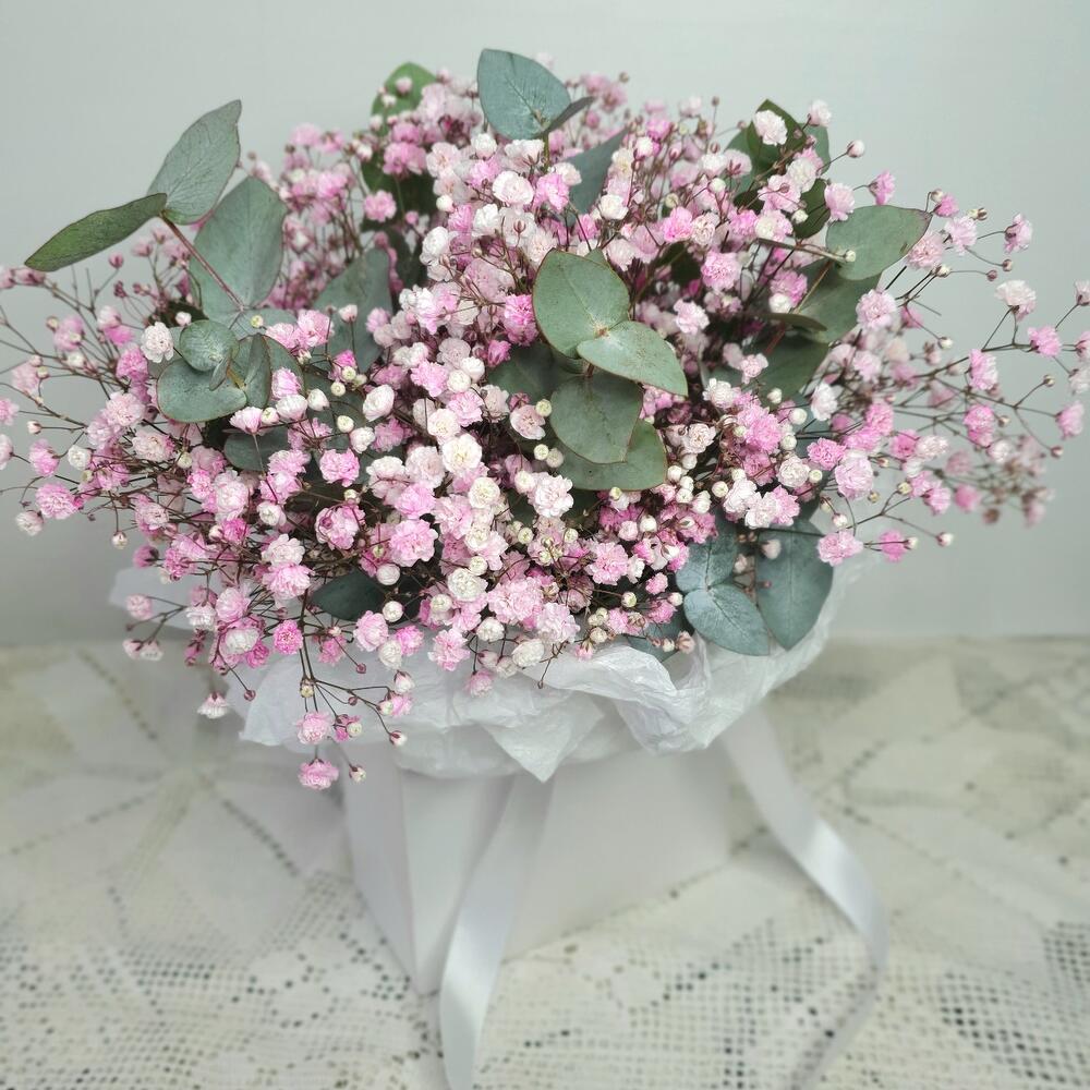 Нежная композиция в сумочке из воздушной гибсофилы с добавлением эвкалипта)))Станет прекрасным подарком)))