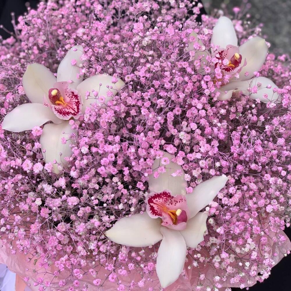 Гипсофила – 10 шт.Орхидея Цимбидиум – 3 шт.Коробка шляпная – 1 шт.Оазис флористический – 2 шт.Пленка матовая – 1 шт.Тишью – 3 шт.Лента атласная – 4 шт.