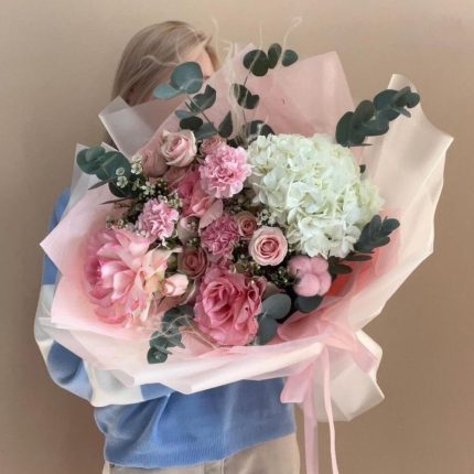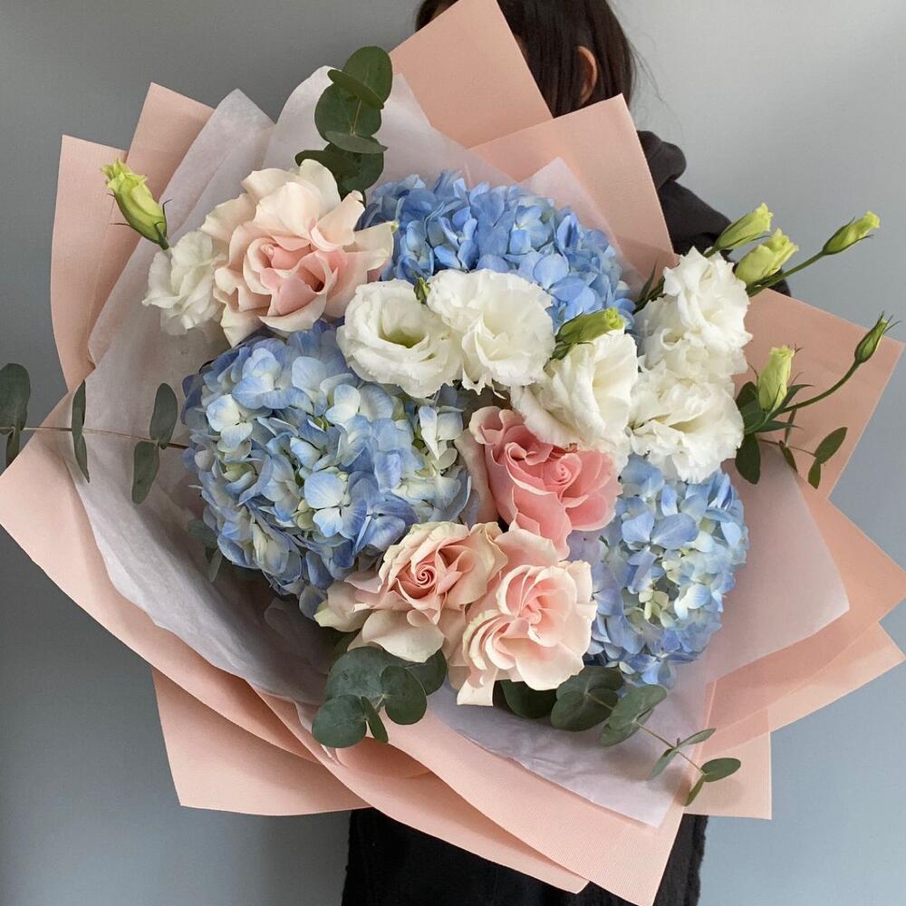 Авторский букет с голубыми гортензиями
