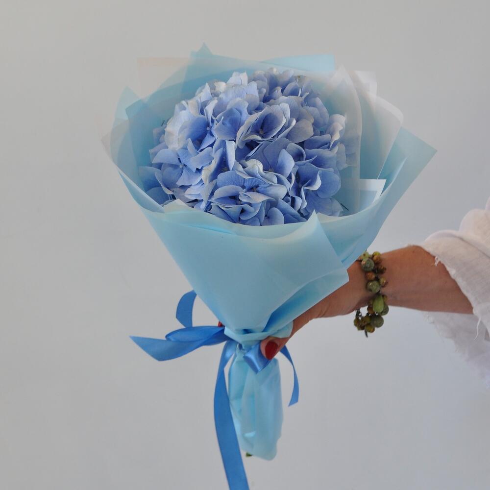 Лента атласная – 1 шт.Гортензия голубая – 1 шт.Пленка матовая – 4 шт.