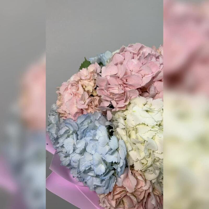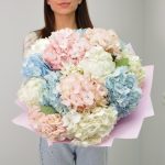 Гортензия – 15 шт.Лента атласная – 2 шт.Фоамиран (упаковка) – 2 шт.подкормка для срезанных цветов – 1 шт.инструкция по уходу за цветами – 1 шт.