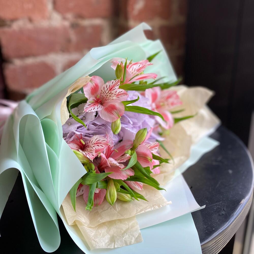 Альстромерия – 2 шт.Гортензия – 1 шт.Упаковка дизайнерская – 1 шт.Лента атласная – 1 шт.