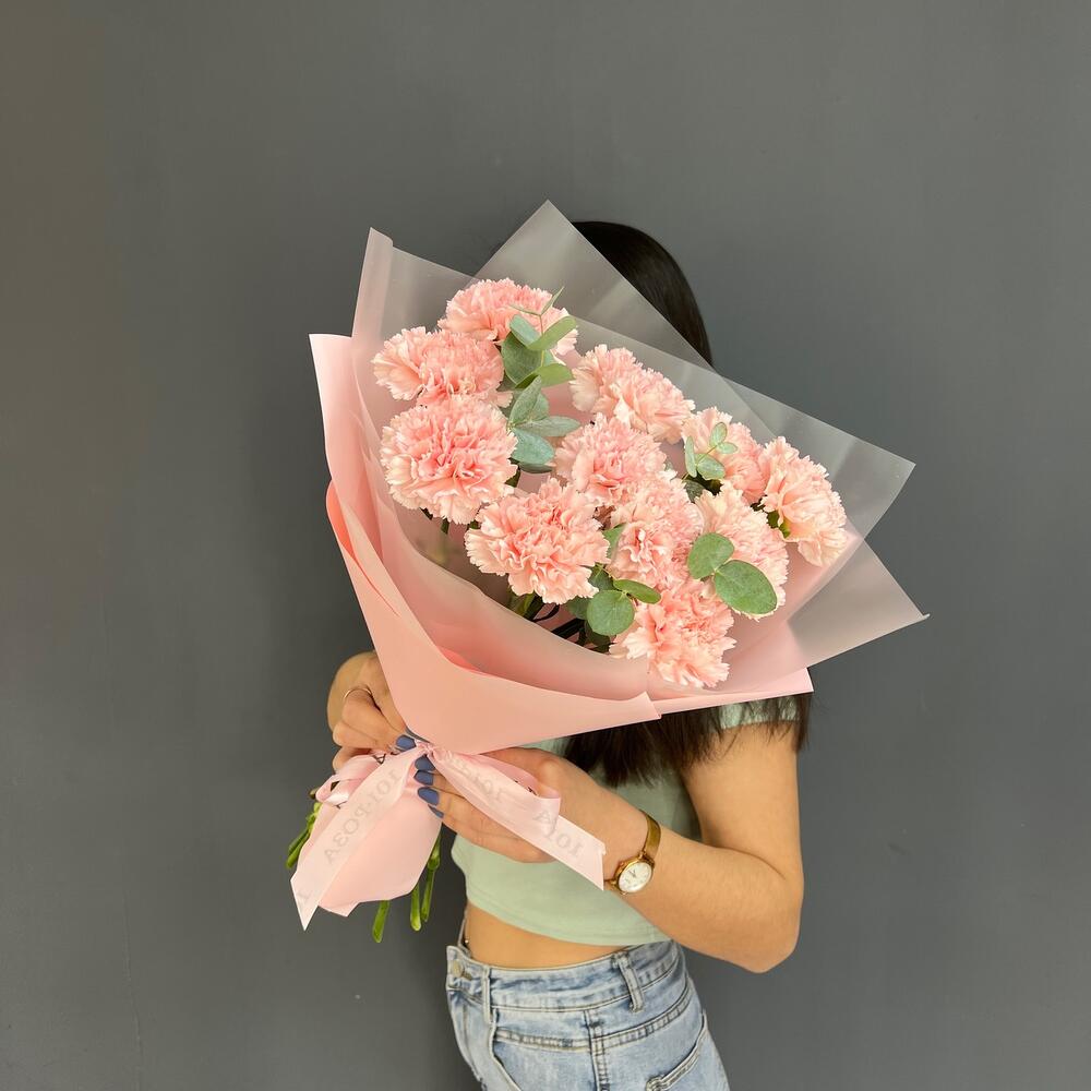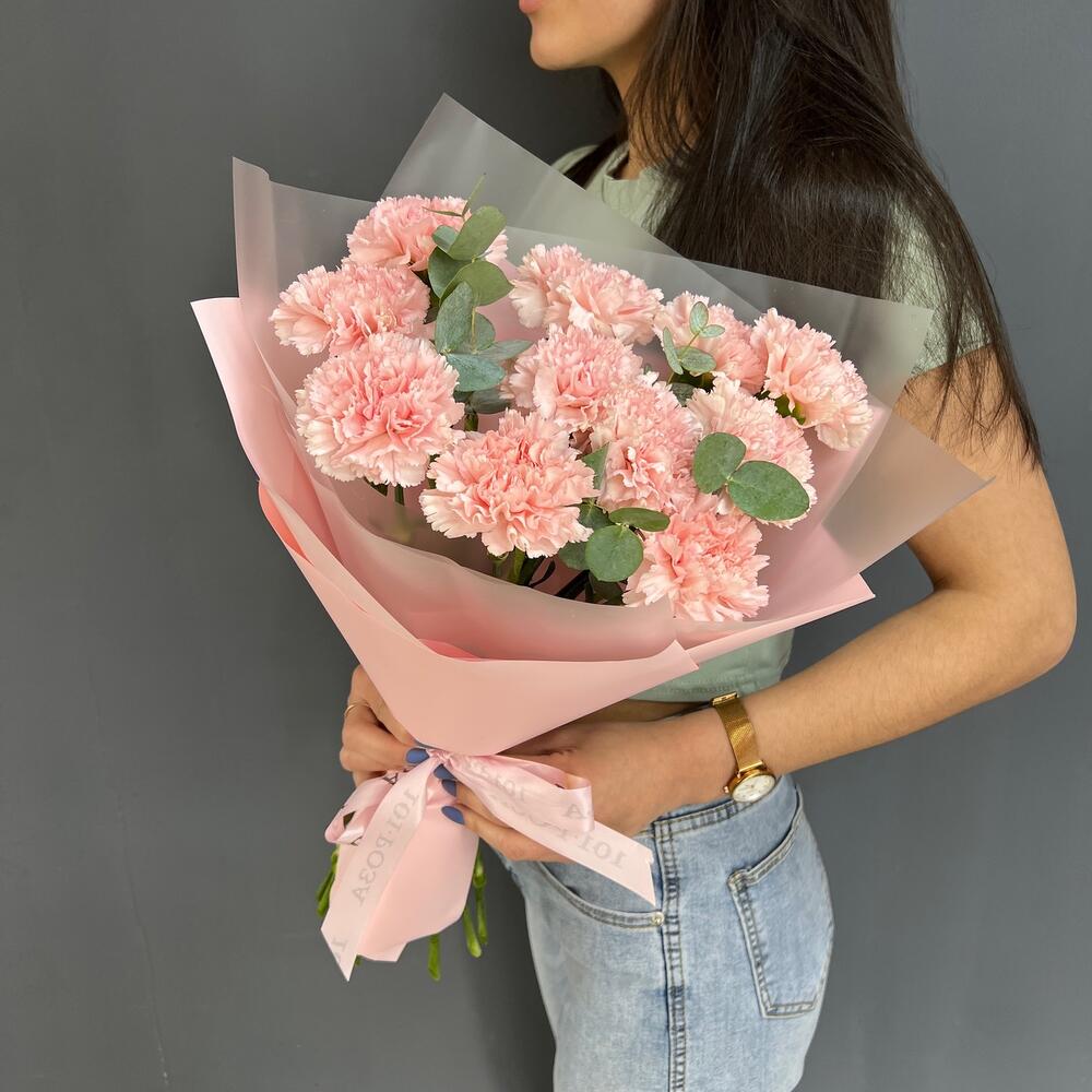 11 нежно-розовых диантусов с эвкалиптом