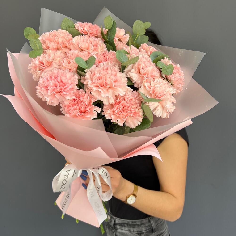 17 нежно-розовых диантусов с эвкалиптом