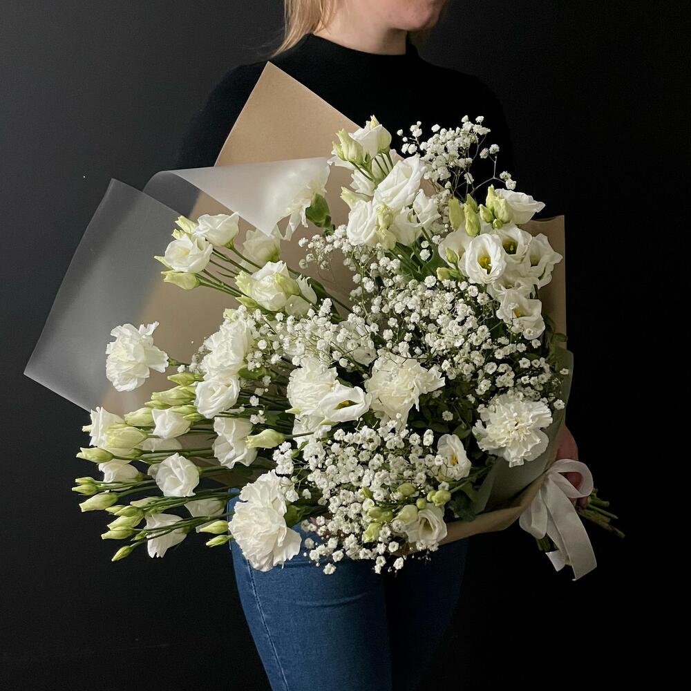 Гипсофила – 3 шт.Диантус – 7 шт.Фисташка – 3 шт.Крафт – 3 шт.эустома белая – 5 шт.