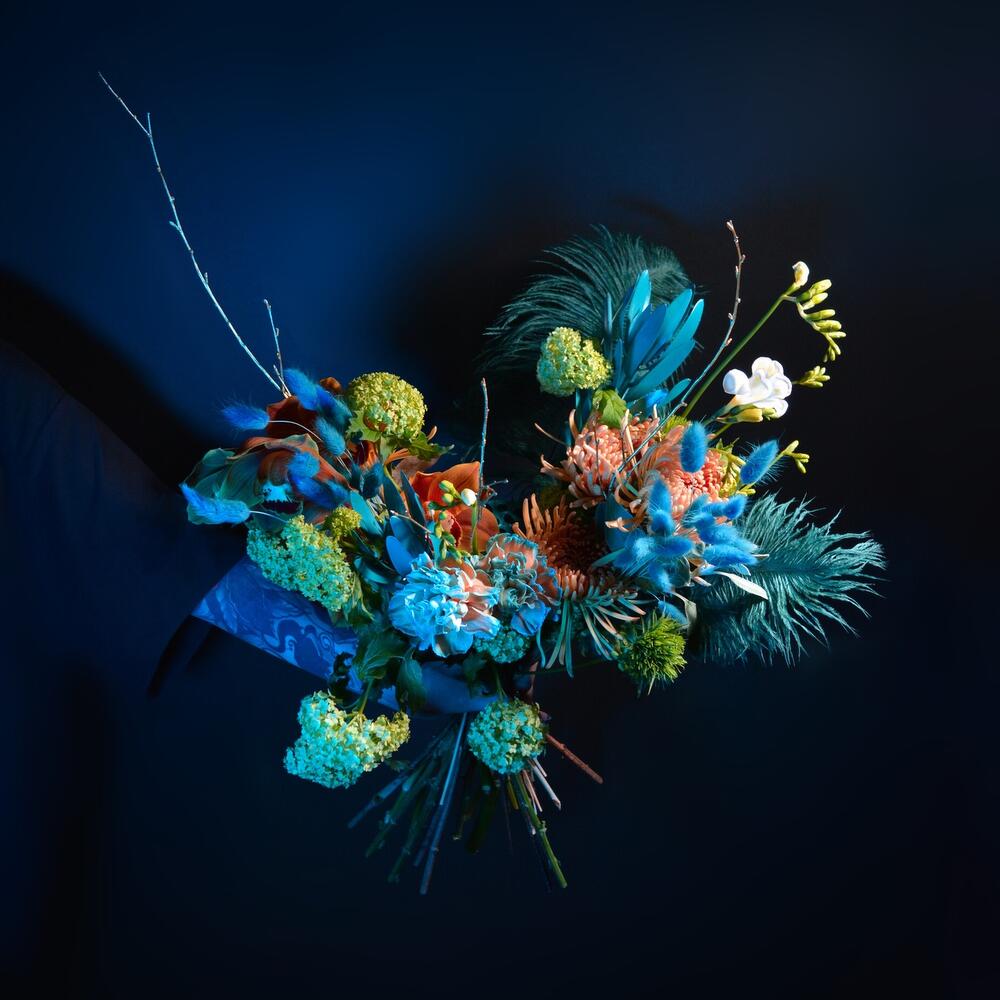 цимбидиум ветка – 1 шт.Хризантема – 4 шт.Гвоздика – 5 шт.Вибурнум – 3 шт.леукондендрон – 3 шт.мелкоцвет – 5 шт.Сухоцветы – 10 шт.
