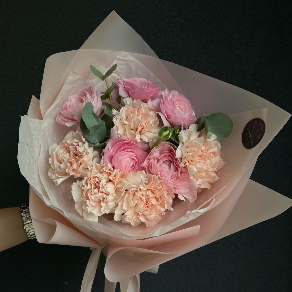 Ранункулюс – 5 шт.диантусы – 5 шт.Эвкалипт – 2 шт.декоративная упаковка – 1 шт.Атласная лента – 1 шт.