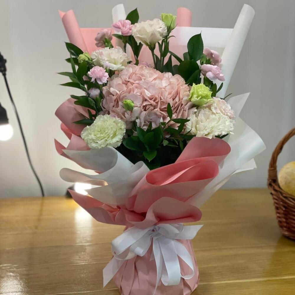 Гортензия розовая – 1 шт. Диантус – 3 шт. Эустома – 3 шт. Рускус – 5 шт.