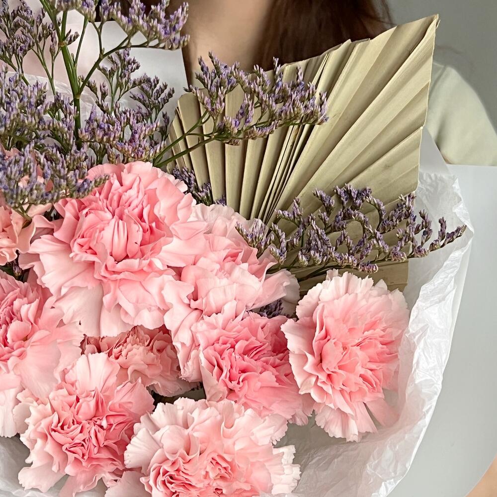 Лента – 1 шт.Лимониум – 1 шт.Гвоздика – 9 шт.Дизайнерская упаковка – 1 шт.пальма пика сухоцвет – 1 шт.
