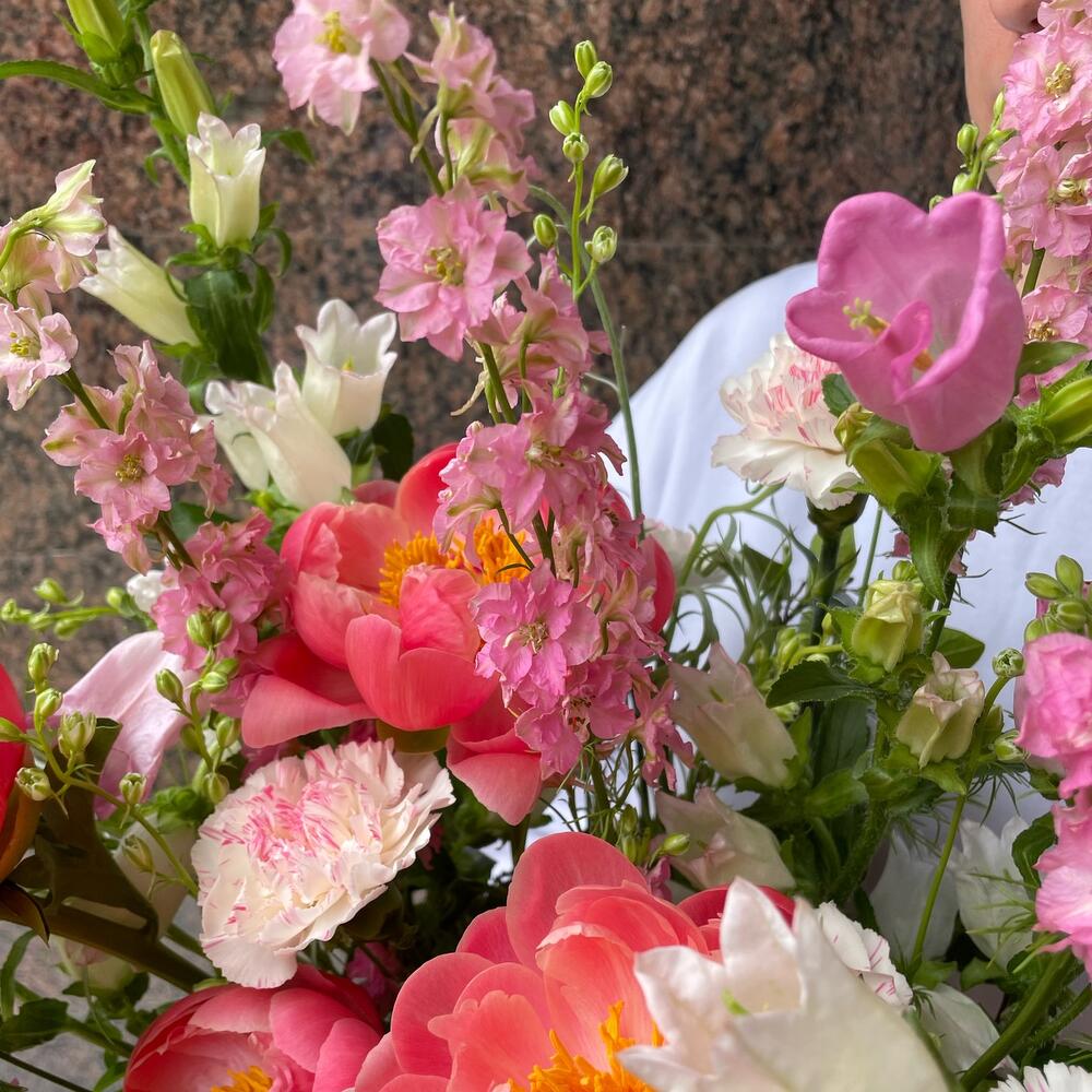 Дельфиниум – 5 шт.Кампанула – 5 шт.Пион Коралл Шарм (Coral Charm) – 7 шт.Диантус – 7 шт.Коробка шляпная – 1 шт.Оазис – 1 шт.василек – 3 шт.Лента бархат – 1 шт.сезонная зелень – 2 шт.