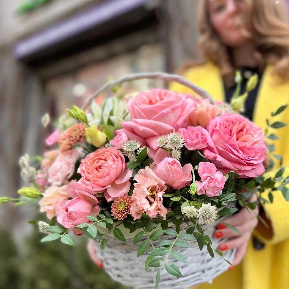 Роза пионовидная – 4 шт.Роза кустовая пионовидная – 2 шт.Лизиантус – 2 шт.Астранция – 3 шт.Диантус – 6 шт.Альстромерия – 2 шт.Сантини – 3 шт.зелень декоративная – 7 шт.Флористическая губка – 2 шт.