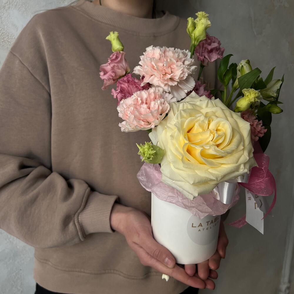 Альстромерия – 1 шт.Лизиантус – 1 шт.Гвоздика – 2 шт.Коробка шляпная – 1 шт.Пионовидная роза – 1 шт.Оазис – 1 шт.