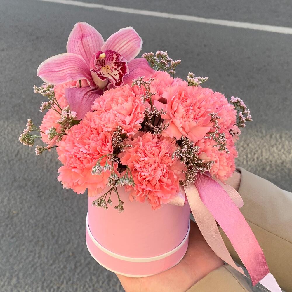 Лента – 2 шт.Лимониум – 2 шт.Орхидея Цимбидиум – 1 шт.Диантус – 11 шт.Пленка – 1 шт.Шляпная коробка – 1 шт.Губка флористическая – 1 шт.