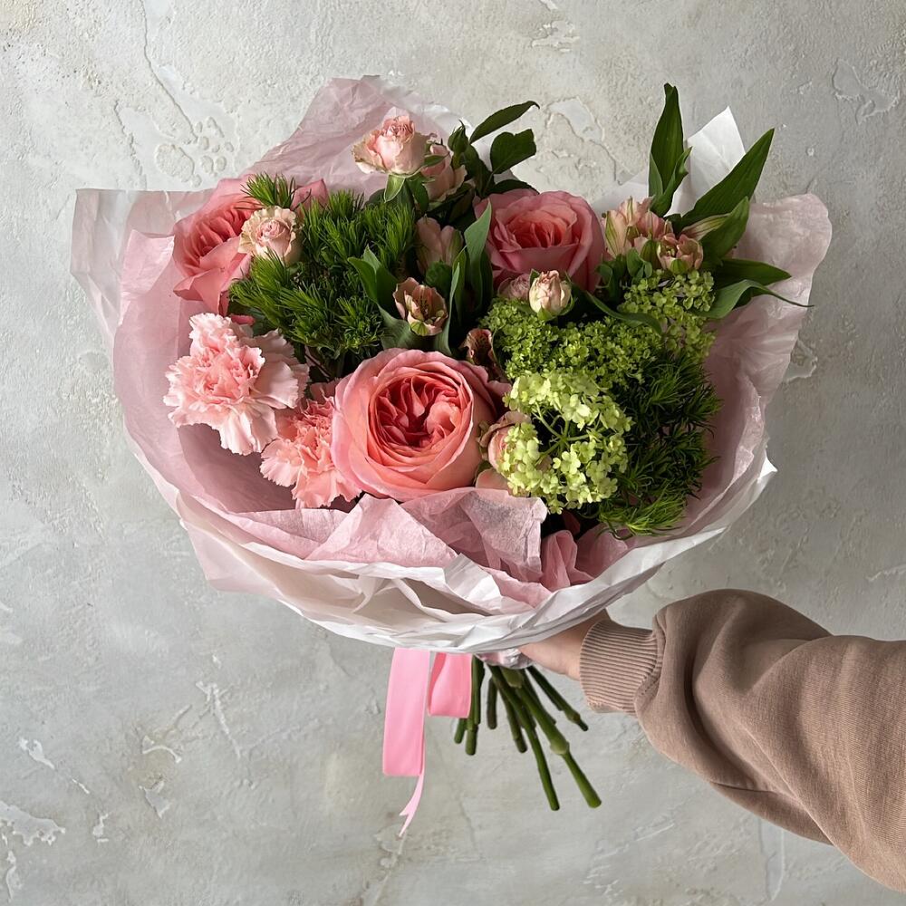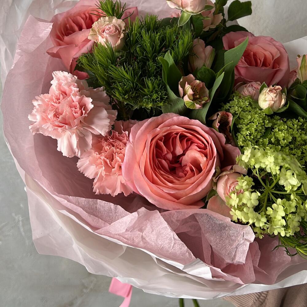 Альстромерия – 2 шт.Кустовая роза – 2 шт.Диантус – 2 шт.Роза пионовидная – 3 шт.Упаковка дизайнерская – 1 шт.грин трикс – 3 шт.