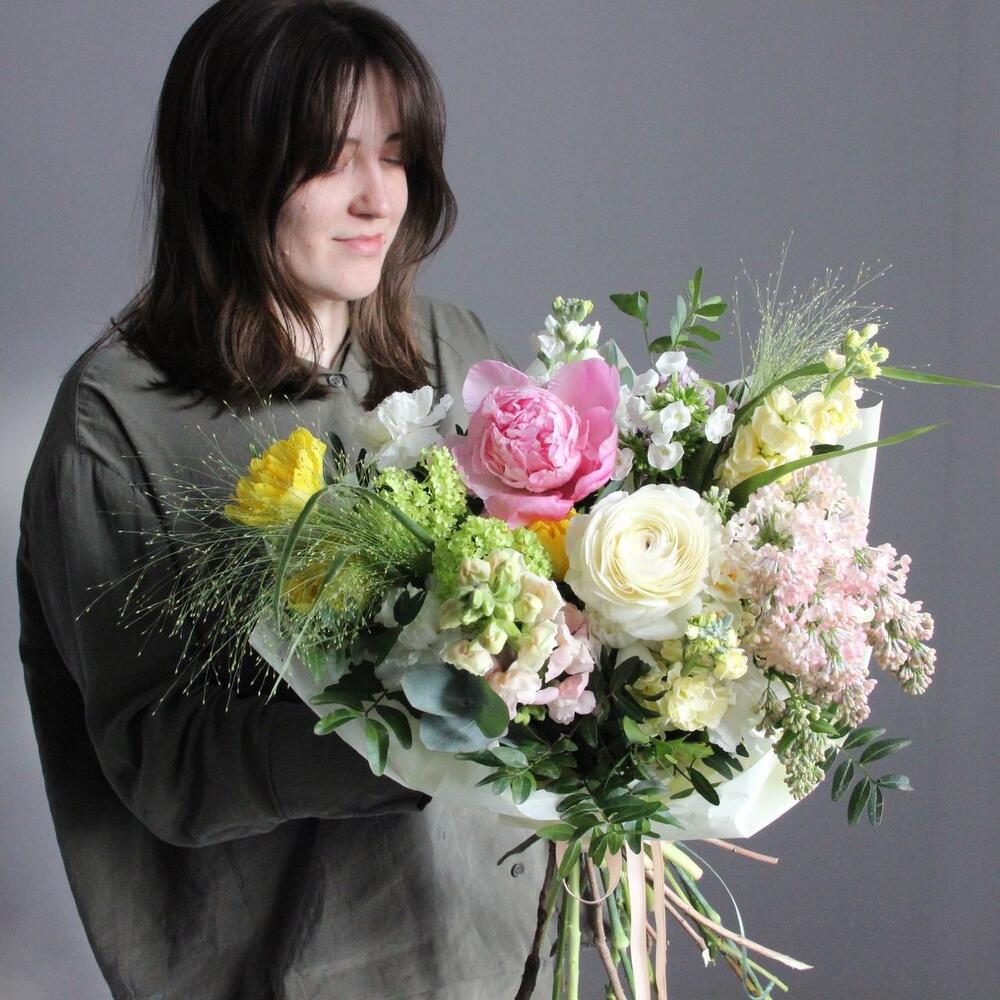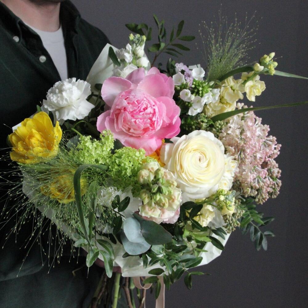 Садовый букет с пионом, сиренью, маттиолой, тюльпанами, флоксами, ранункулюсом, львиным зевом, паникумом и диантусами.