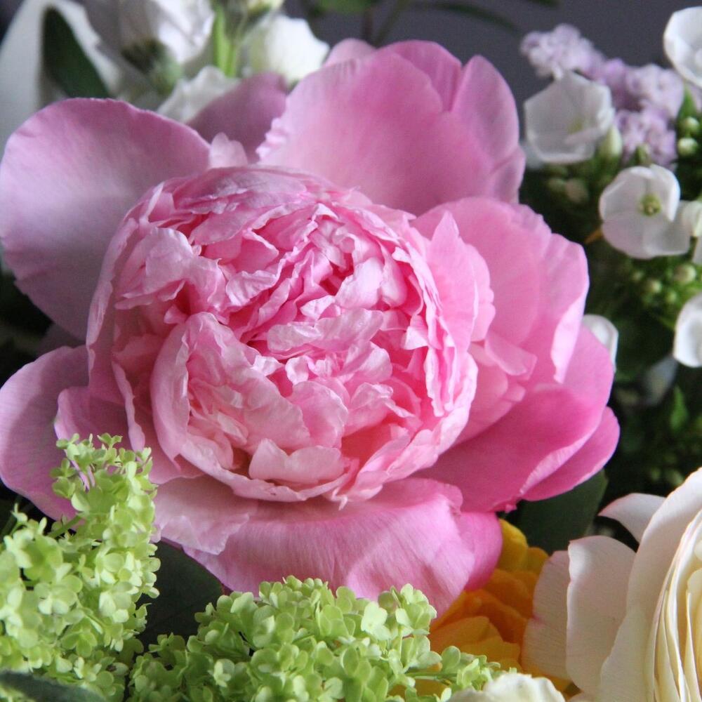 Садовый букет с ранункулюсами и пионовидными розам