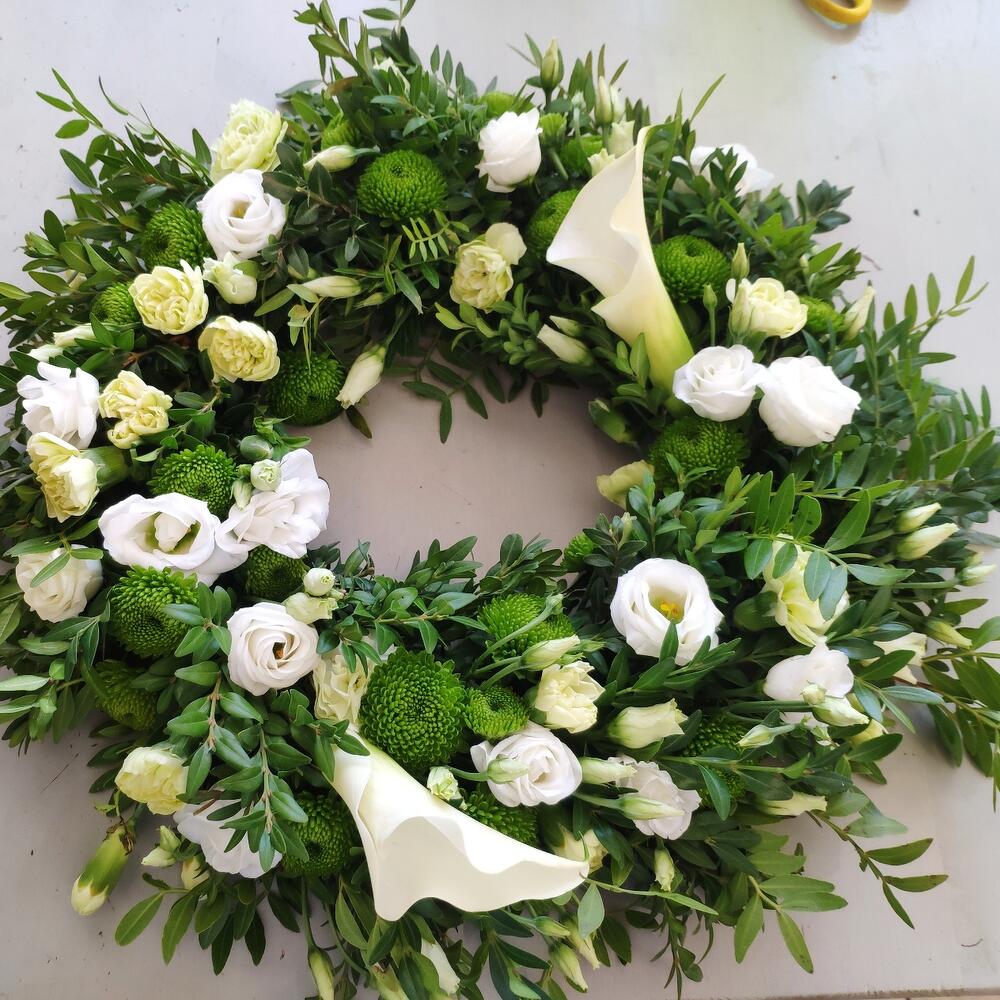 каллы белые – 10 шт.эустома белая – 10 шт.хризантемы кустовые – 5 шт.диантусы сортовые – 10 шт.Самшит – 5 шт.