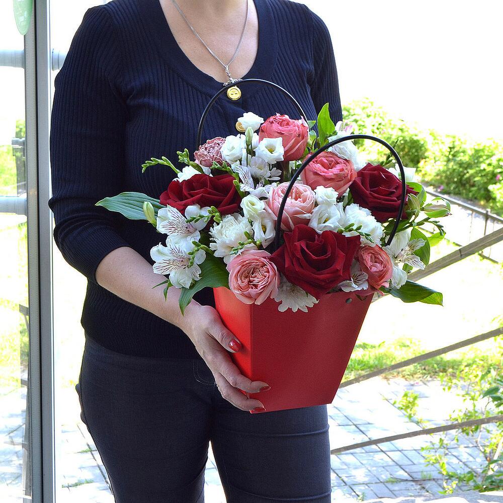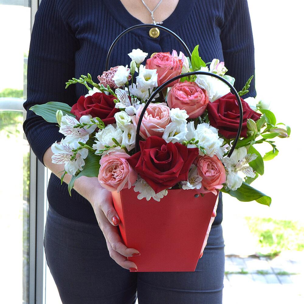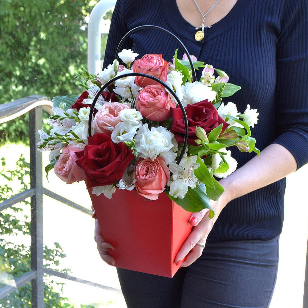 Яркие и красивые цветы с пионовидными розами в большой коробке