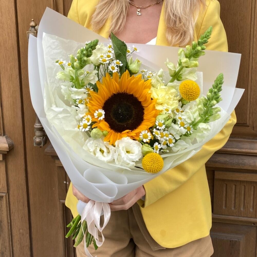 Солнечный яркий букет, выполненный из подсолнуха, лизиантуса, маттиолы и краспедии.Такой букет точно понравится яркой и энергичной получательнице, и будет долго радовать её.К букету прилагается открытка с вашими пожеланиями, инструкцию по уходу за цветами и приятный комплимент от нашего магазина – шоколадка.Мы также будем рады отправить вместе с букетом конфеты, шоколад ручной работы или б/а вино по вашим пожеланиям, просто напишите нам в личные сообщения. Заказывая наш букет, Вы всегда получите исключительный сервис и заботу о клиенте