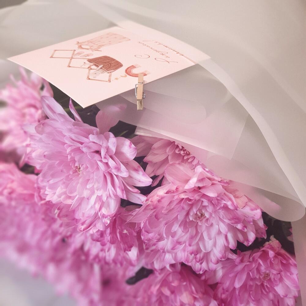 Хризантема кустовая – 5 шт.Лента атласная – 1 шт.Упаковка дизайнерская – 2 шт.Кризал (подкормка) – 1 шт.