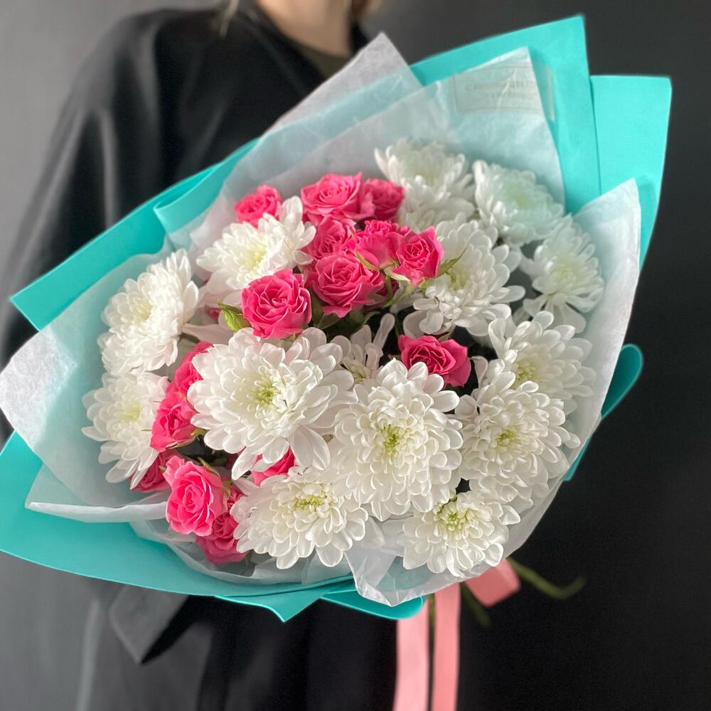 Хризантема кустовая – 3 шт.Упаковка – 1 шт.Роза кустовая розовая – 3 шт.