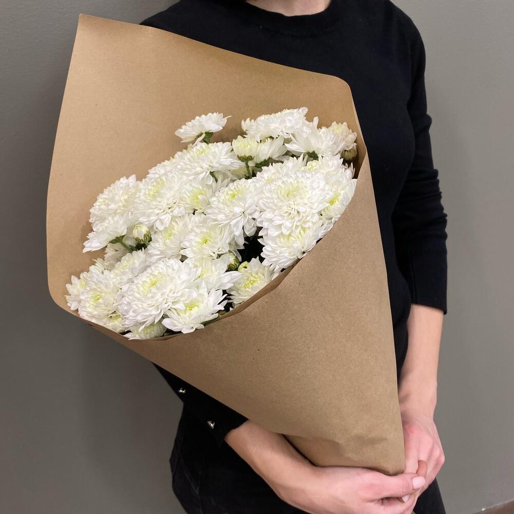 Хризантема кустовая – 11 шт.Крафт упаковка – 1 шт.Лента атласная – 1 шт.