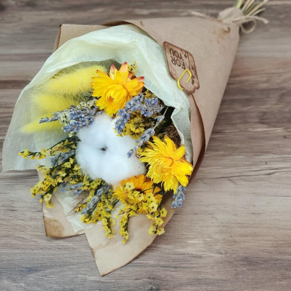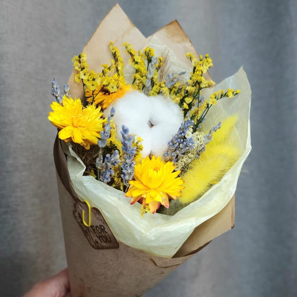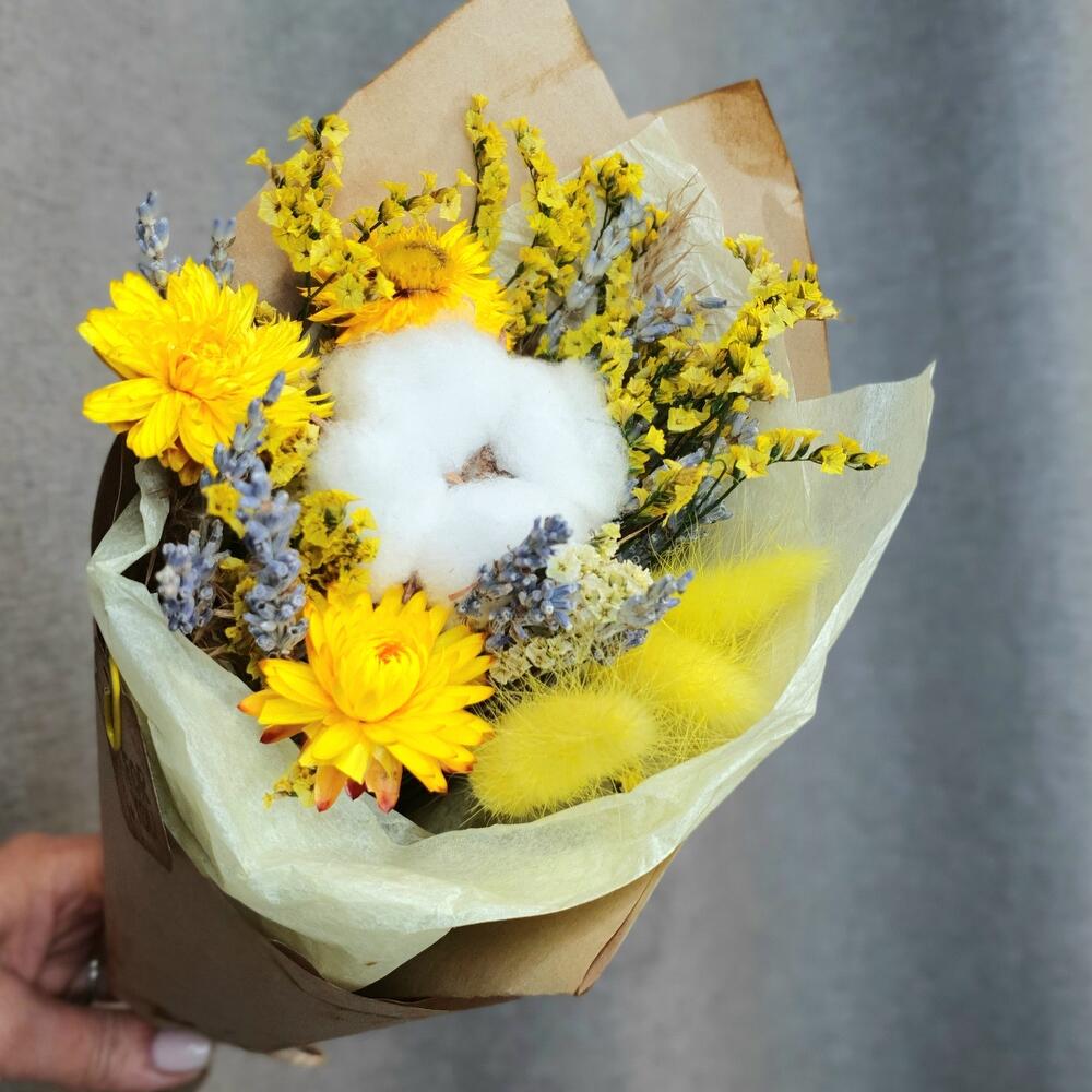 Хлопок натуральный – 1 шт.лавандин пучок – 1 шт.Гелихризум – 3 шт.Лагурус – 3 шт.статица стабилизированная пучок – 1 шт.Упаковка дизайнерская – 2 шт.